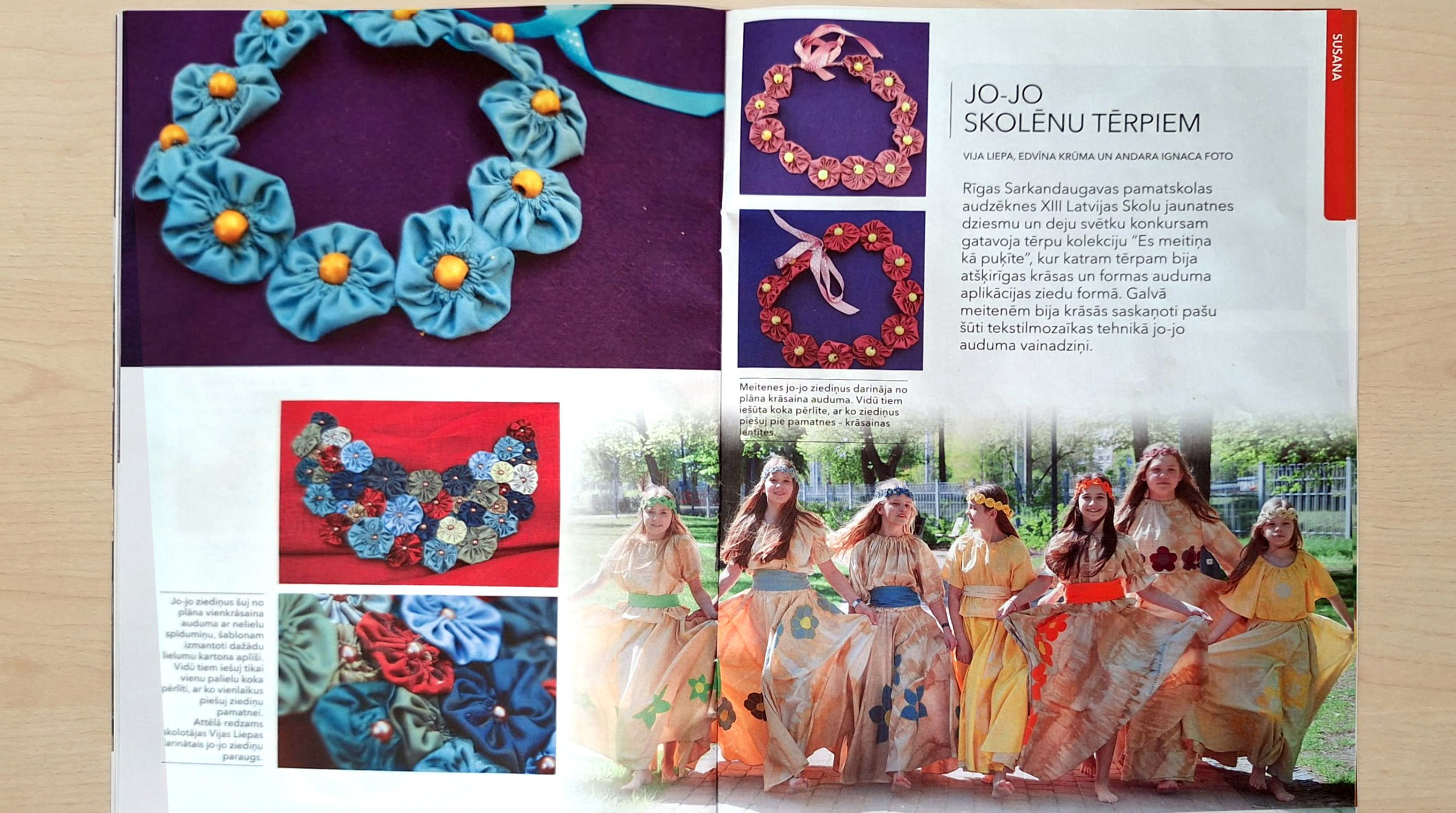 Rīgas Sarkandaugavas pamatskolas audzeknes XIII Latvijas Skolu jaunatnes dziesmu un deju svētku konkursam gatavoja terpu kolekciju “Es meitiņa kā puķīte”, kur katram tērpam bija atškirīgas krāsas un formas auduma aplikācijas ziedu formā. Galvā meitenēm bija krāsās saskanoti pašu šūti tekstilmozaīkas tehnikā jo-jo auduma vainadziņi.
